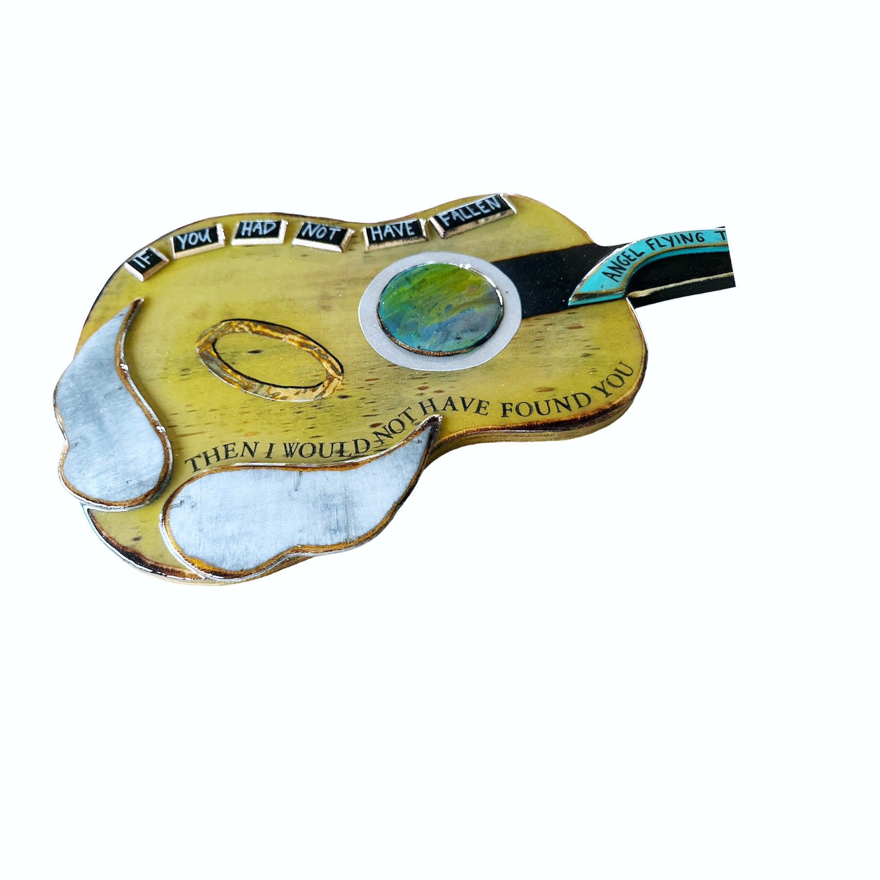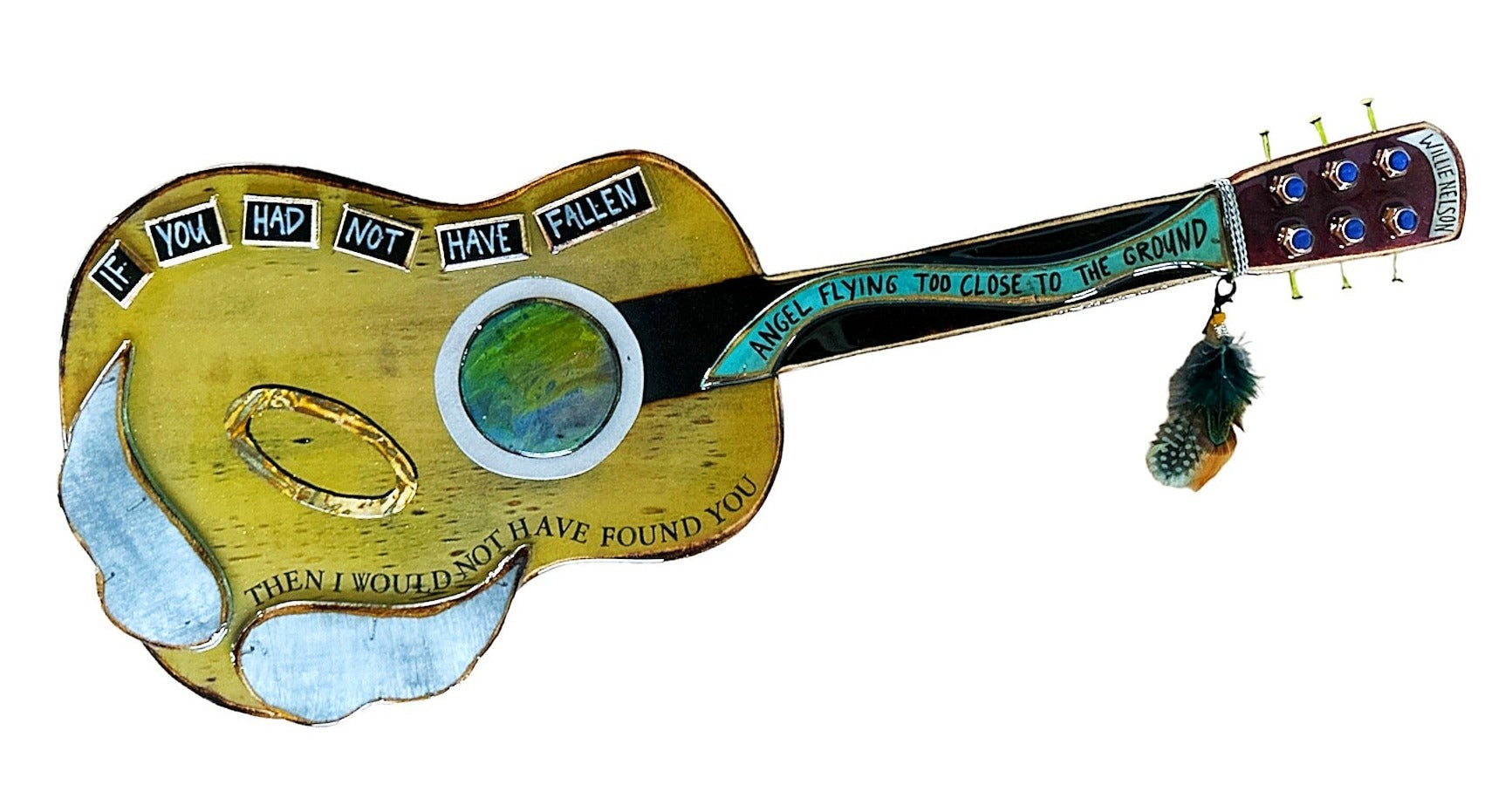 Funky Willie Nelson inspired guitar. This piece measures approximately 28 inches long